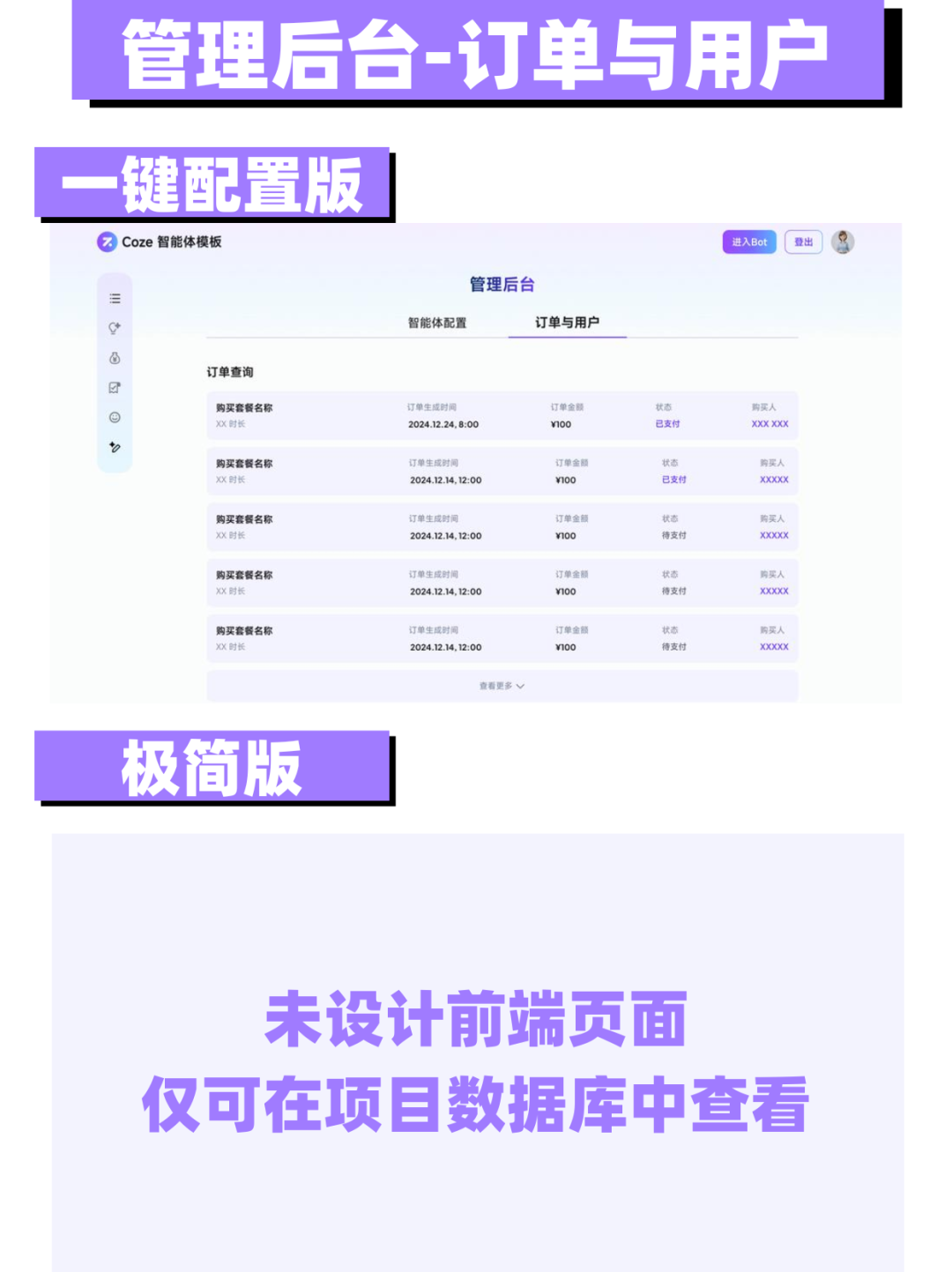 2. 订单与用户信息查看:在“管理后台”页面除了可以进行智能体配置,还可查看已付费订单以及注册用户,方便运营维护。
