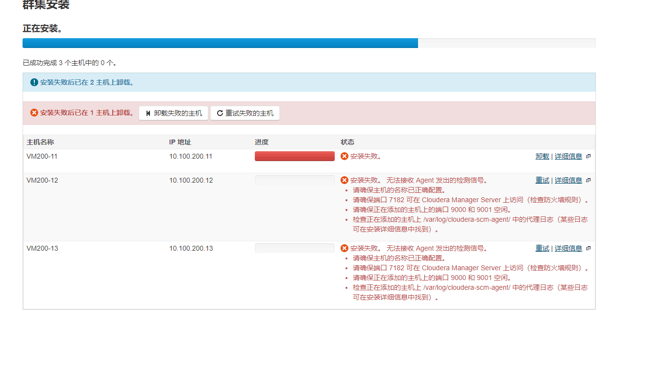 看到上面的截图第一台机器是没有安装成功,但是对于第二台和第三台机器来说是已经安装成功了,首先应该检查一下看上面爆的错误的这两个端口有没有没占用。如果没有被占用的话。就进行下面的操作: