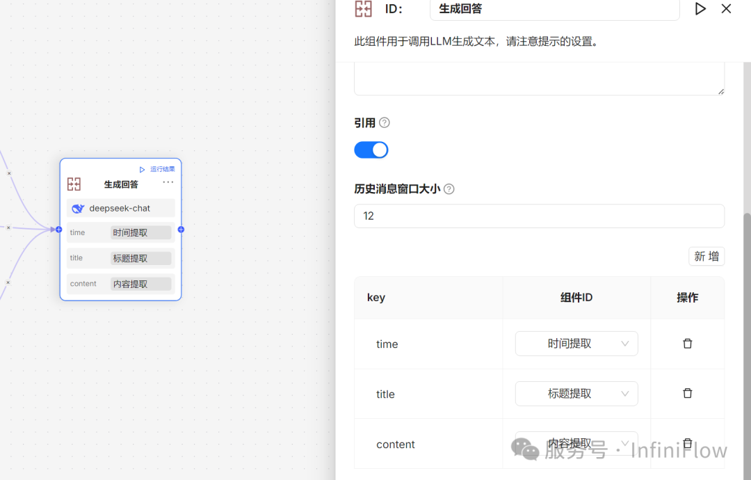 4.4 需要让大模型生成回答,因此添加一个生成回答节点:选择大模型之后,添加三个变量:{time}来源于“时间提取”节点,{title}来源于“标题提取”节点,{content}来源于”内容提取“节点。然后编写提示词,让大模型结合三个变量进行回答;