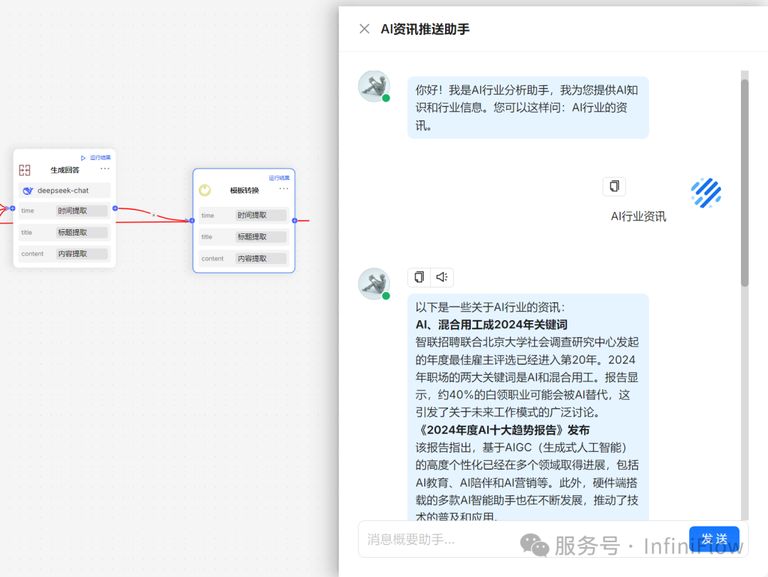 AI资讯推送助手介绍:支持分步抓取资讯的时间、标题和内容,并以总结概括的形式返回。在初始阶段,该助手将指导用户进行提问。接收到用户提问后,助手会对问题进行分类处理:若问题属于AI相关领域,助手将提取问题中的关键词并启动网络搜索;若问题不属于AI领域的范畴,助手将提醒用户进行AI范围内的提问。助手在进行网络搜索后,会分步提取发布时间、标题和内容,并进行内容的总结概括。随后,助手将利用模板转换模块将内容按照固定格式进行输出。本助手旨在帮助用户查询AI行业的相关资讯,并通过总结概括将关键内容推送给用户,减少用户的阅读成本。