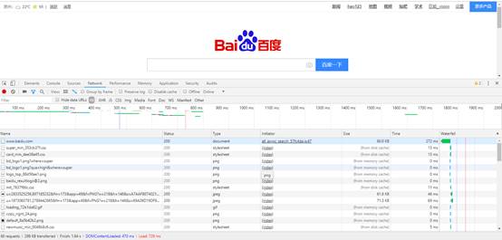 3、点击network,再点击一下上面的“百度一下”,会发现浏览器与百度服务器之间有一系列的信息交互。