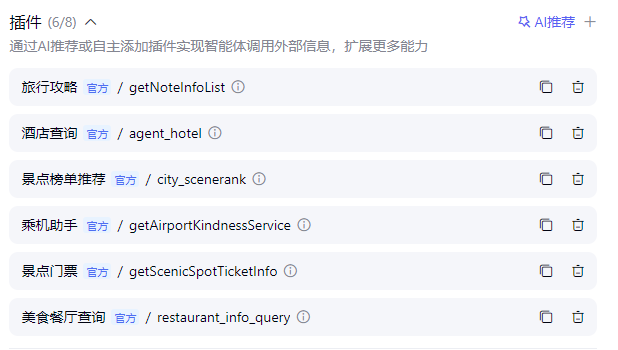 上面这几个插件在旅游类智能体的插件中,可以说是完全够用了,可以根据自己的需要选择不同的插件,插件可以选择多个组合使用。