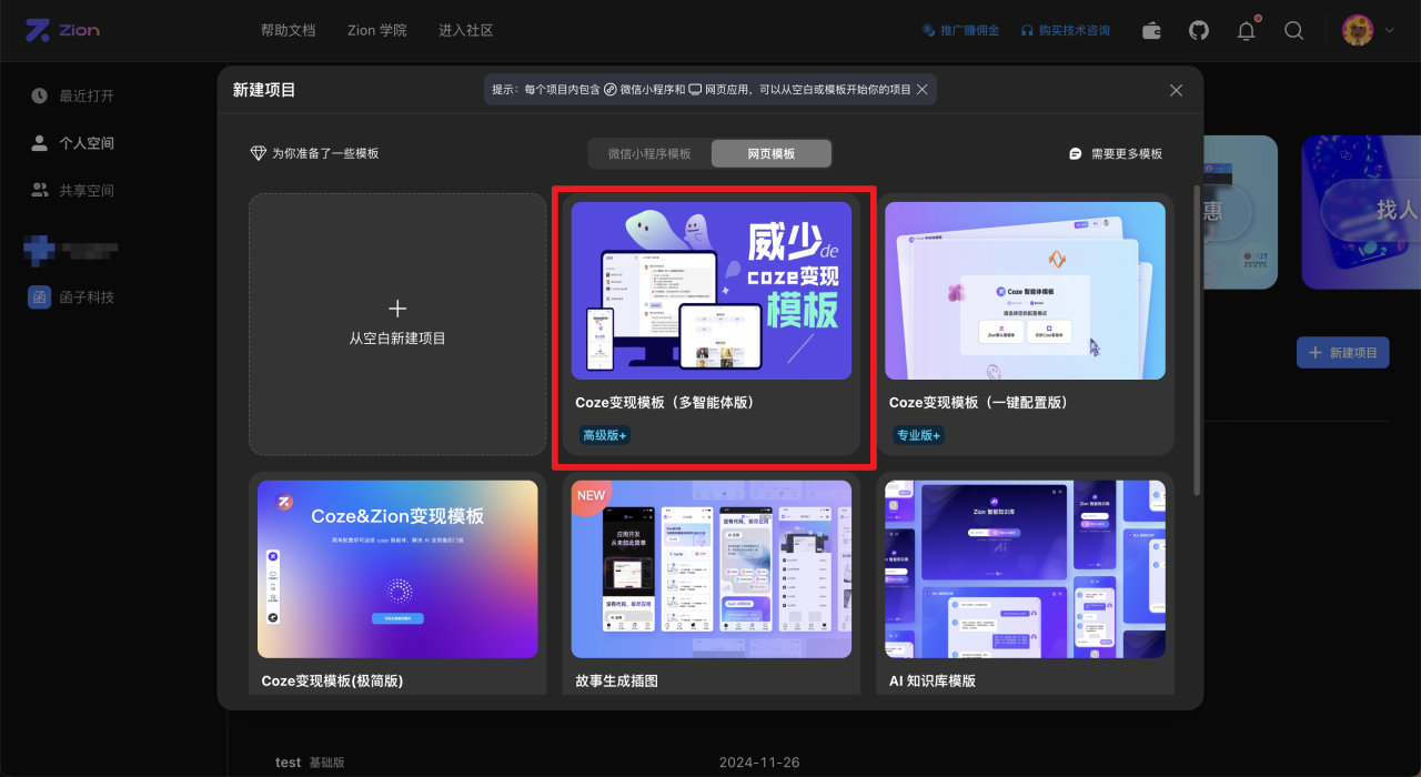 选择“Coze变现模板(多智能体版)”并“新建项目”,记得使用代金券进行抵扣。