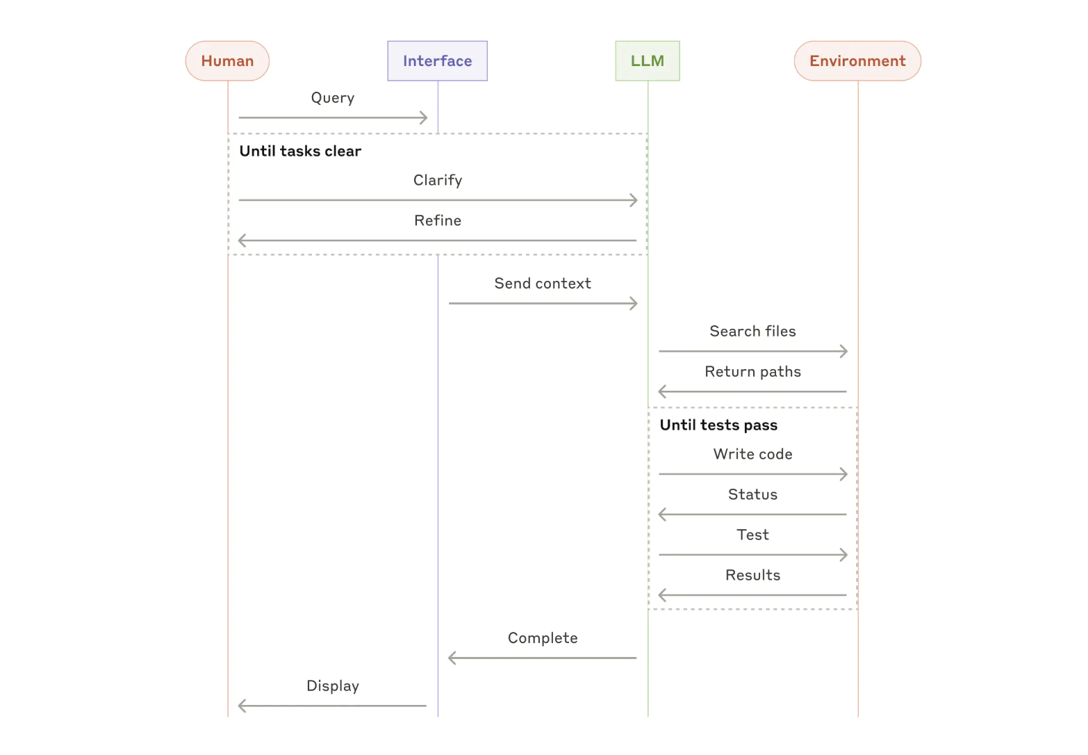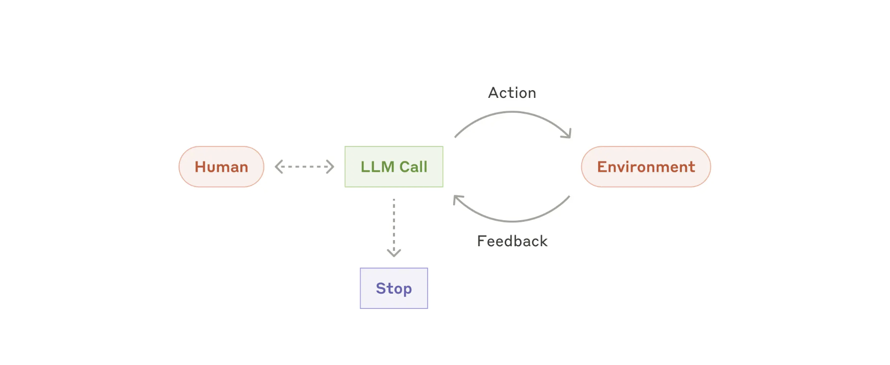 随着 LLM 在关键功能(理解复杂输入、进行推理和规划、可靠地使用工具以及从错误中恢复)方面的成熟,智能体正在生产中出现。智能体通过人类用户的命令或交互式讨论开始工作。一旦任务明确,智能体就会独立计划和运行,可能会返回给人类以获取更多信息或判断。在执行过程中,智能体在每个步骤中从环境中获取“基本事实”(例如工具调用结果或代码执行)以评估其进度至关重要。然后,智能体可以在检查点或遇到障碍时暂停以获取人类反馈。任务通常在完成后终止,但通常也包括停止条件(例如最大迭代次数)以保持控制。