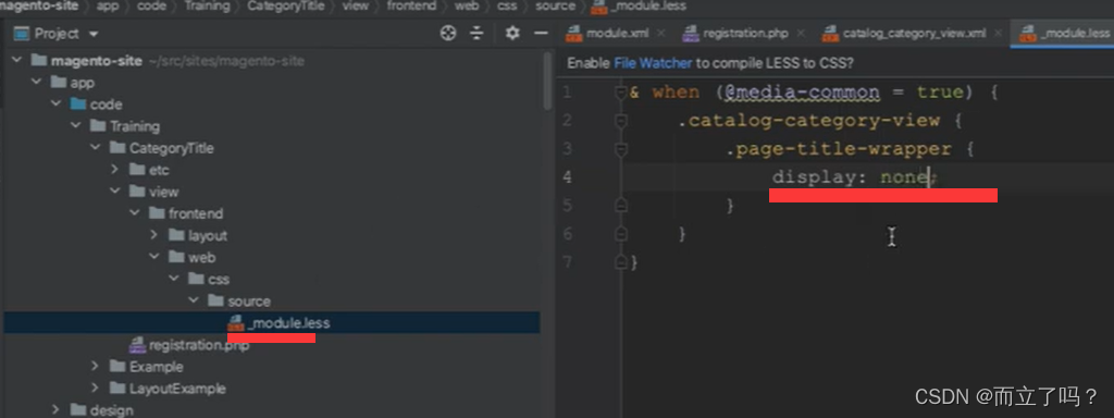 在自己定义的module中,定义一个category_category_view.xml(就是原先module_category内定义那个页面的xml),写一个一样的页面。然后把定义title的block reference过来进行remove就可以了。