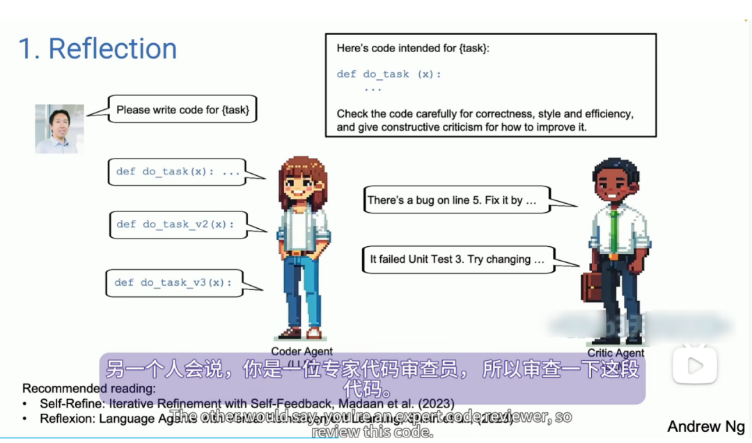 这个想法的一个自然演变是,不是一个单一的代码代理,你可以有两个代理,其中一个是代码代理,另一个是批判代理。这些可能是相同的基础LLM模型,但你以不同的方式提示它们。