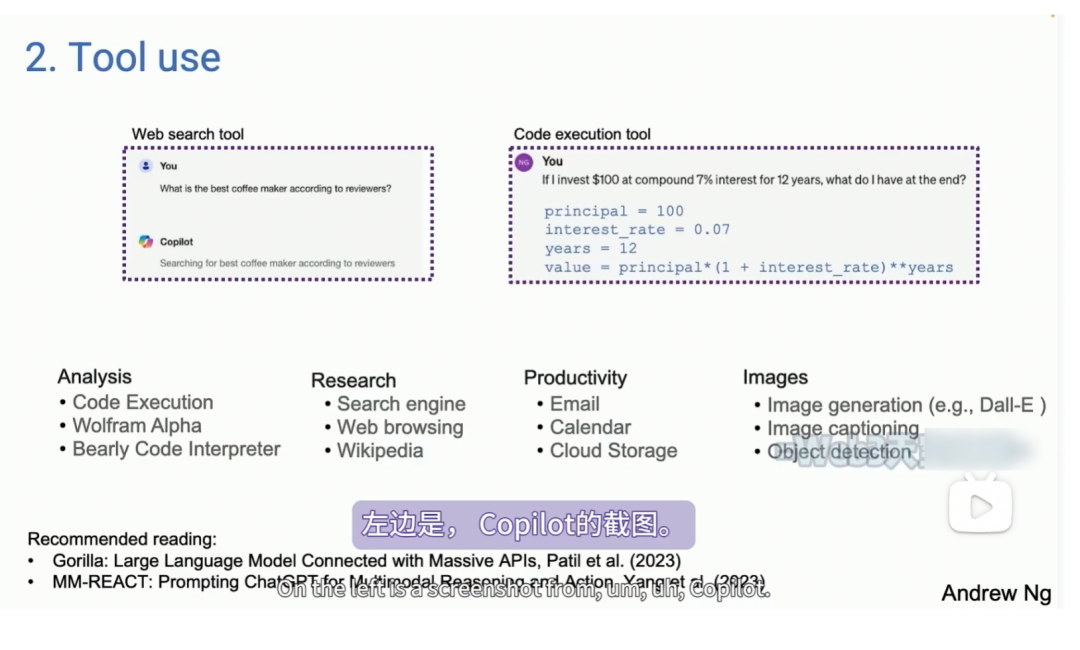 你们中已经有人见过LLM系统使用工具了,左边是Copilot的截图,右边是从GPT-4中提取的东西。