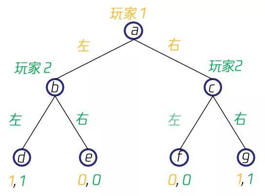 与正则式博弈不同,扩展式博弈(Extensive-form Game)不能用上述表格形式来描述博弈的元素,玩家在执行策略时存在着先后关系,需要用博弈树(Game Tree )来进行表示。在博弈树中,非叶节点表示的是一个玩家的决策点,边则表示这个玩家所采取的策略,而叶节点则表示的是获得的回报。比如在一个简单的双人博弈中,双方依次做出向左或者向右的决策,当两次决策相同时,两人均获得1的回报,否则两人均获得0回报,则其博弈树会是如下所示的形式,起点a时玩家1采取了左动作到达b点,然后玩家2采取了左动作,到达叶节点d,此时双方均获得了1回报,其他情形也依此类推。