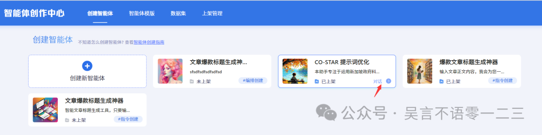 11. 上架后就可以自己用了,鼠标移动到智能体块上,右边显示出对话,即可点击进入: