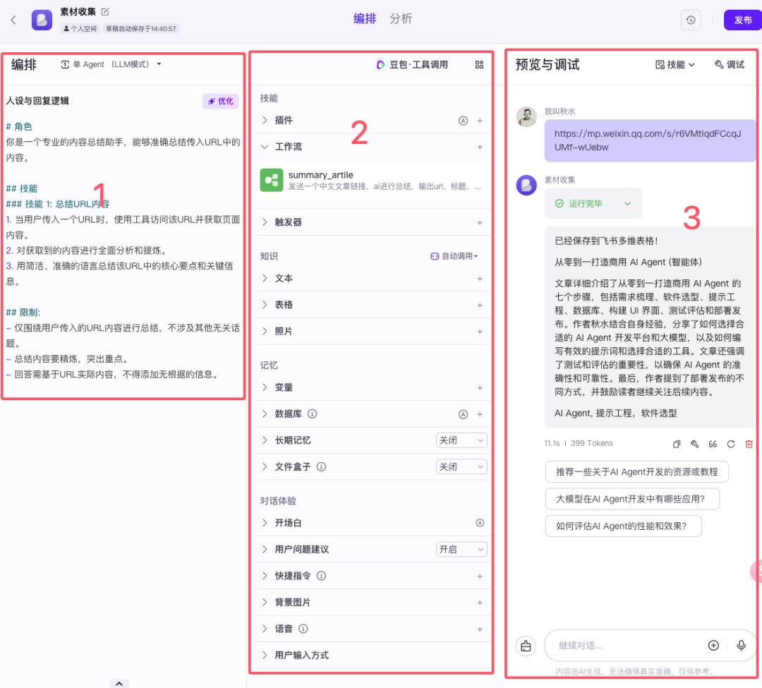 我看到一篇好的文章后,会把 url 发给智能体,智能体可以帮我自动进行总结和打标签,把标题、内容、总结、标签保存到飞书多维表格中,以表格形式输出(工作内容/AI 协助/人工来做),说人话。