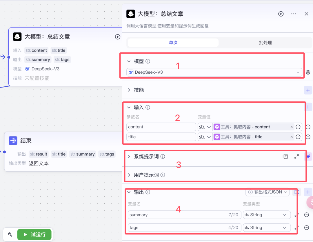 这个节点就是大模型的配置,在这里我们需要大模型帮我总结文章内容,提炼文章关键词。红框 1:此处可以选择不同的模型来处理,不同的提示词在不同的模型下表现有时候是不一致的,所以这里需要注意的是在当前这个场景下根据大模型的特点,选定模型后,再去写系统提示词和用户提示词。红框 2:输入,可以将上个节点输出的参数标题和内容传到这里。