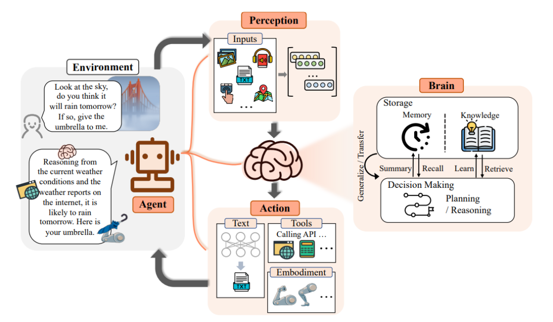 实现方式:Agent根据规划与记忆执行具体行动,如智能客服回复、查询天气预报、AI机器人抓起物体等。