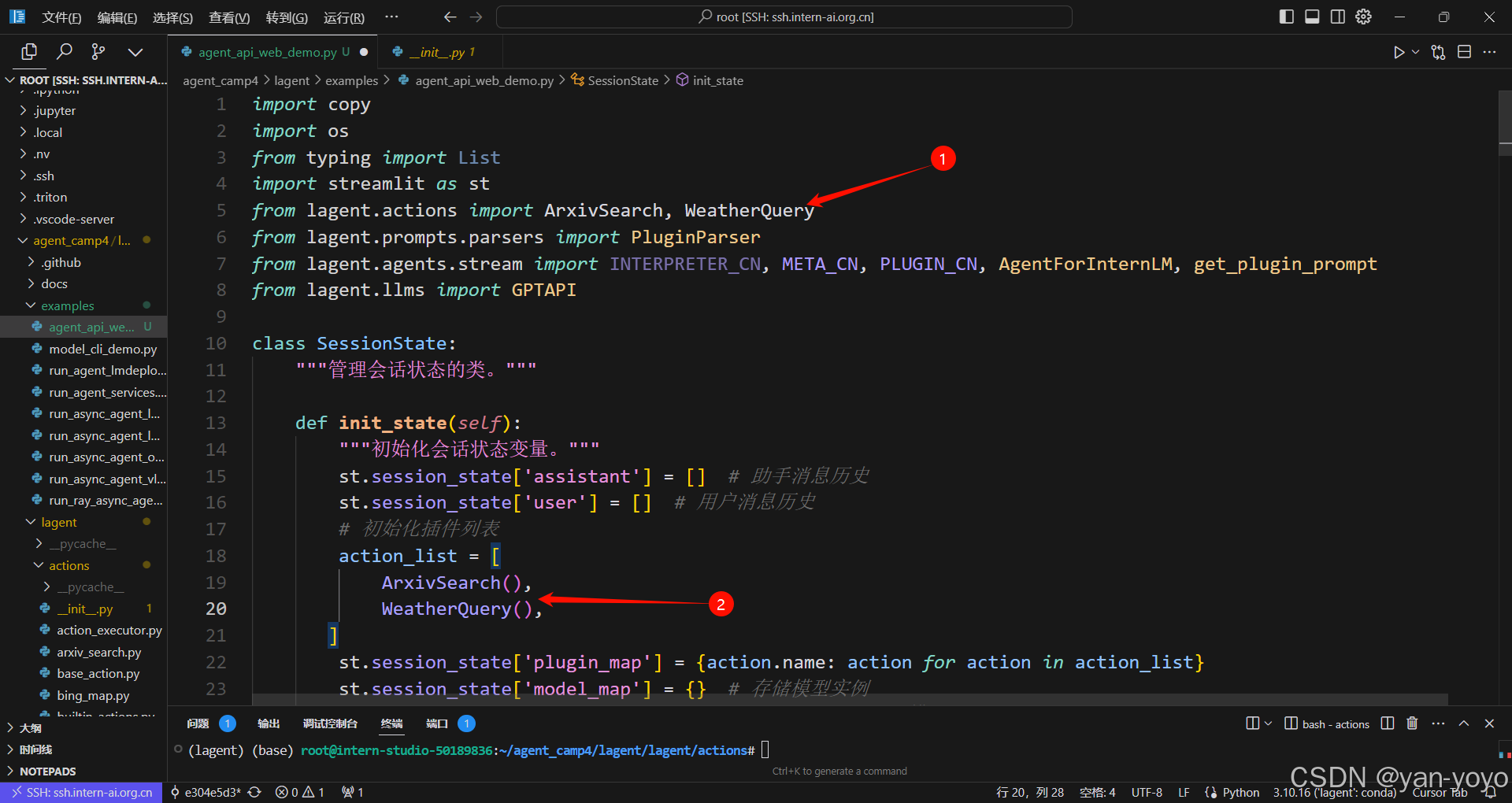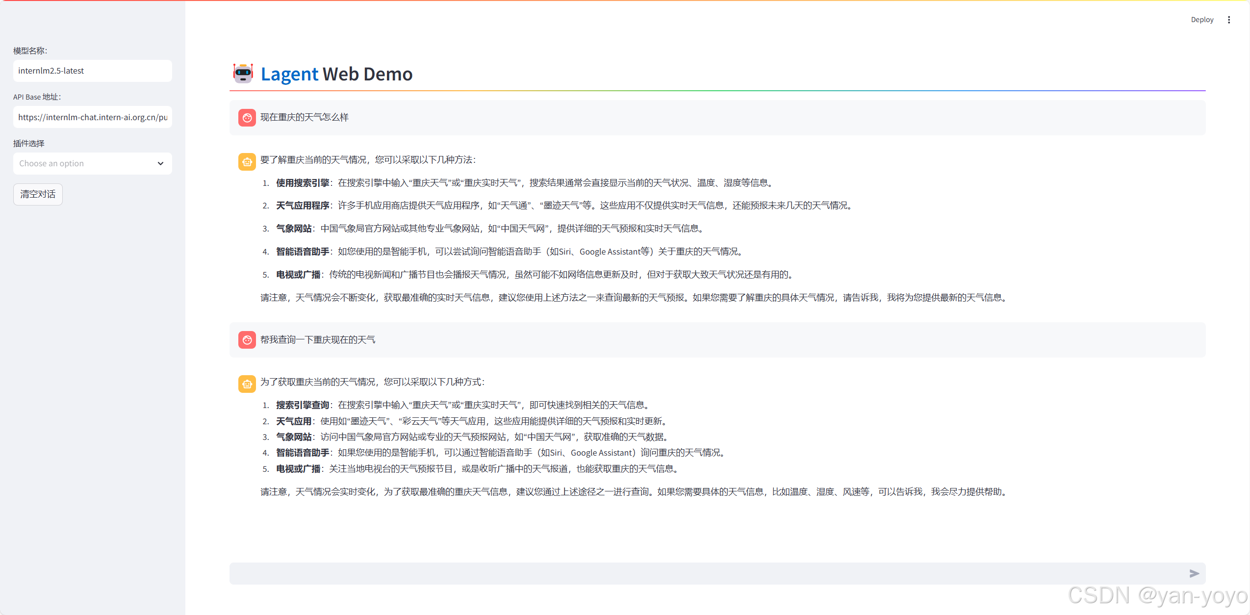 在agent_api_web_demo.py中写入下面的代码,这里利用 GPTAPI 类,该类继承自 BaseAPILLM,封装了对 API 的调用逻辑,然后利用Streamlit启动Web服务: