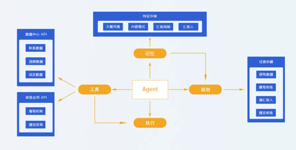 第二步:工具(Tools):针对大模型知识局限,采用 RAG 技术接入私有数据中心 API,获取客户数据;同时接入工作报告应用 API,赋予数据填充与提交权限。