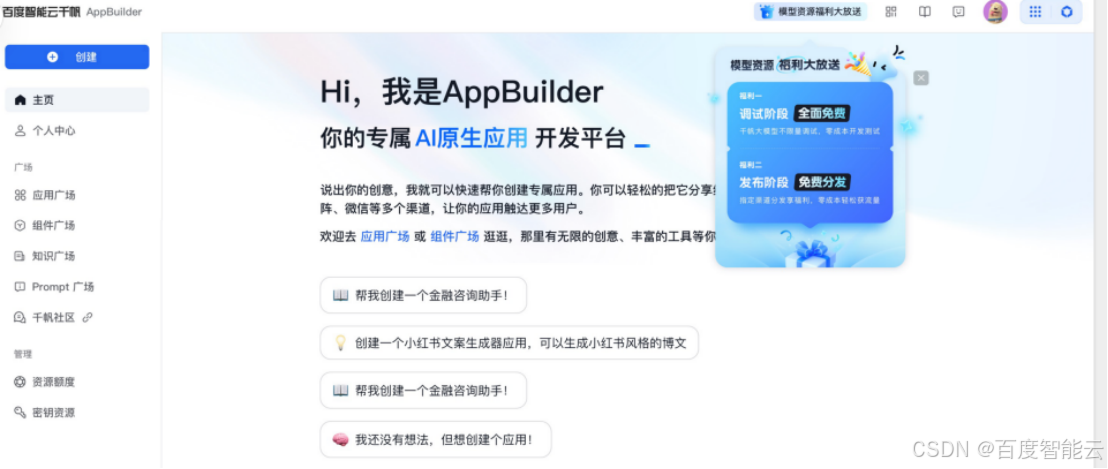 ② 平台体验全面免费: 为了降低应用调试成本,AppBuilder全面开放了官方渠道的免费调用,包括调试、网页版、广场分享、百度搜索和微信小程序等,鼓励更多的应用分享与体验,促进社区的互动和应用的快速迭代。