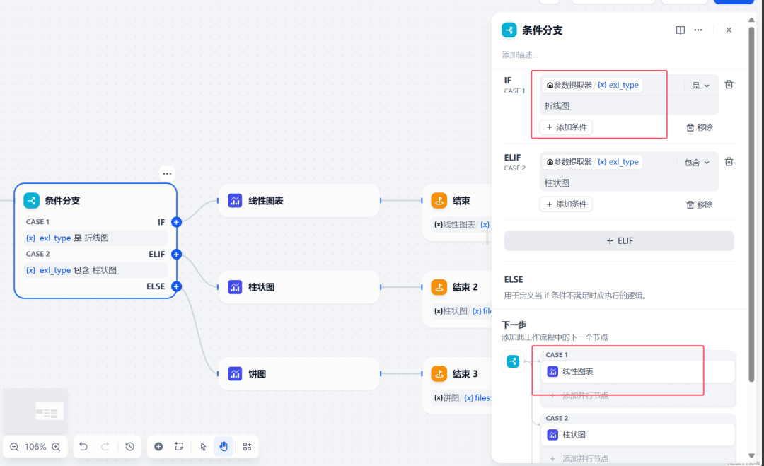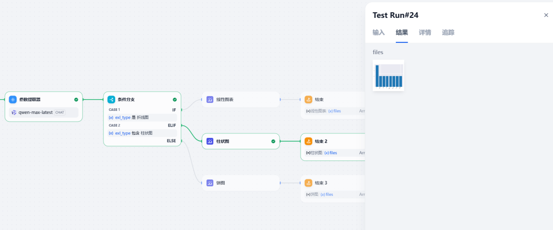 这样下一个条件分支的节点就由大模型来决定了。条件分支这个地方,看着复杂,其实很简单,就是判断大模型给出的图形类型,也就是上一步新增的变量exl_type的值是啥,然后生成对应的图表即可。