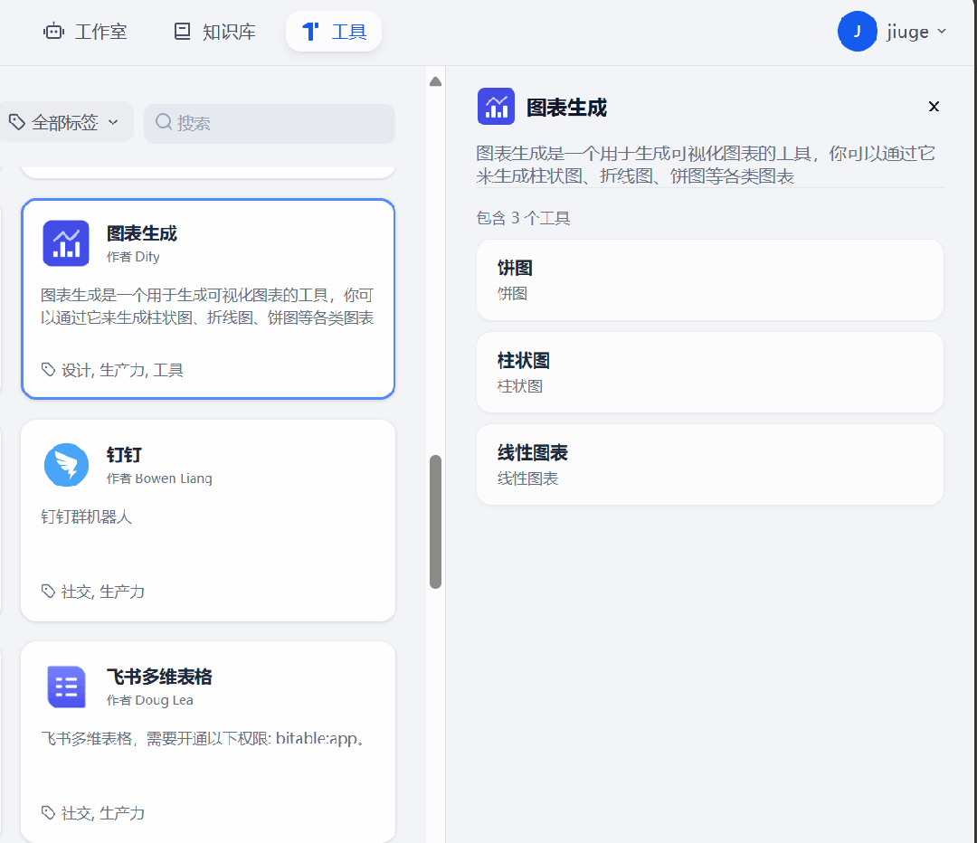 下面就是我们要用到的Dify内置的图表生成工具,很容易就能清楚这三种图表传入的参数要求,都是字符串且格式一样。
