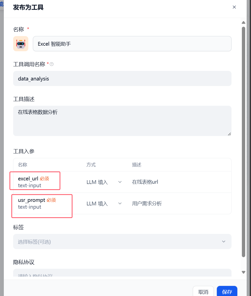 所以你的工作流中的输入变量要调整成下面这样!再发布为工具!
