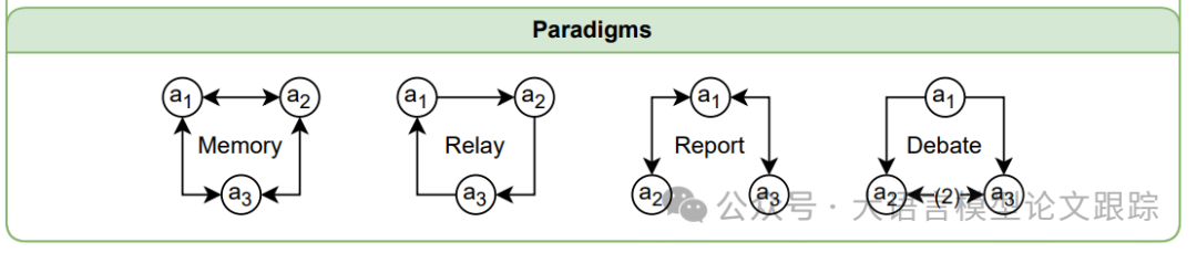 概述了四种不同的范式,在轮次顺序和信息可见性方面存在差异。这些范式分别被称为记忆(memory)、接力(relay)、报告(report)、和辩论(debate)。