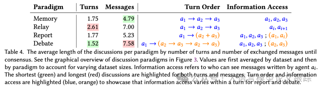 最右侧的列表明了范式的轮次顺序以及智能体之间的信息获取情况,范式影响信息吞吐量。