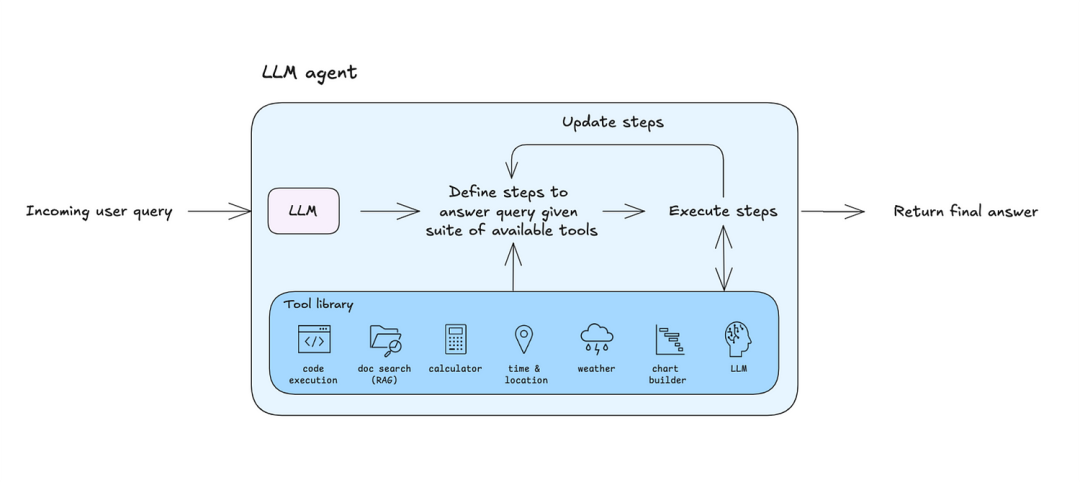当触发工具调用时,工具的输出会被送回给LLM(作为其工作内存的一部分)。随后,LLM将决定如何处理这些新数据:是进行另一个工具调用还是向用户给出答案。