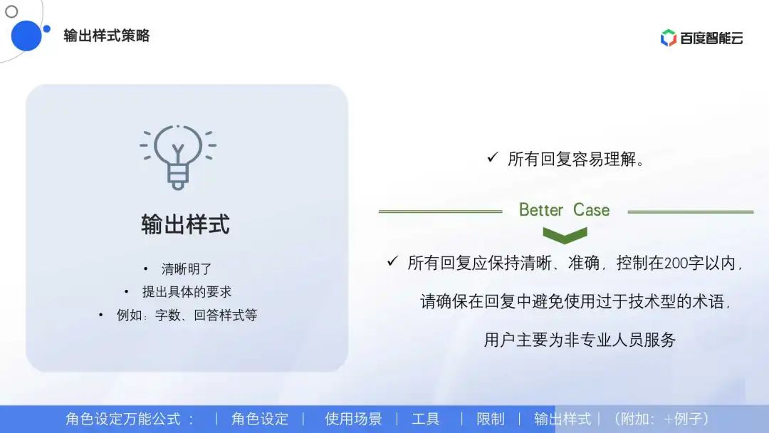 输出样式:输出风格和格式要求,使大模型更为匹配您的需求。可以附带一些例子,使其理解更为透彻。
