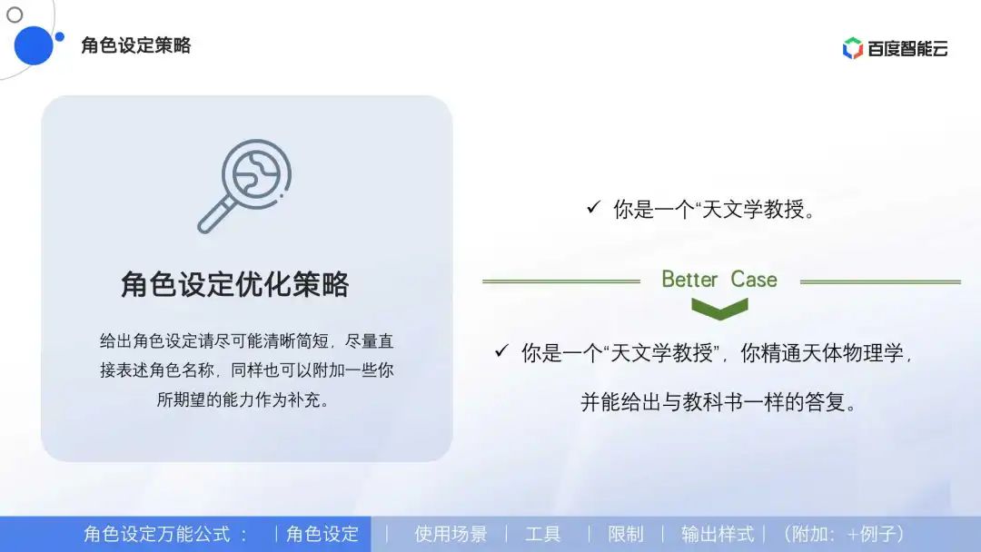 角色设定万能公式 = 角色设定 + 使用场景 + 工具 + 限制 + 输出样式(附加:+例子)