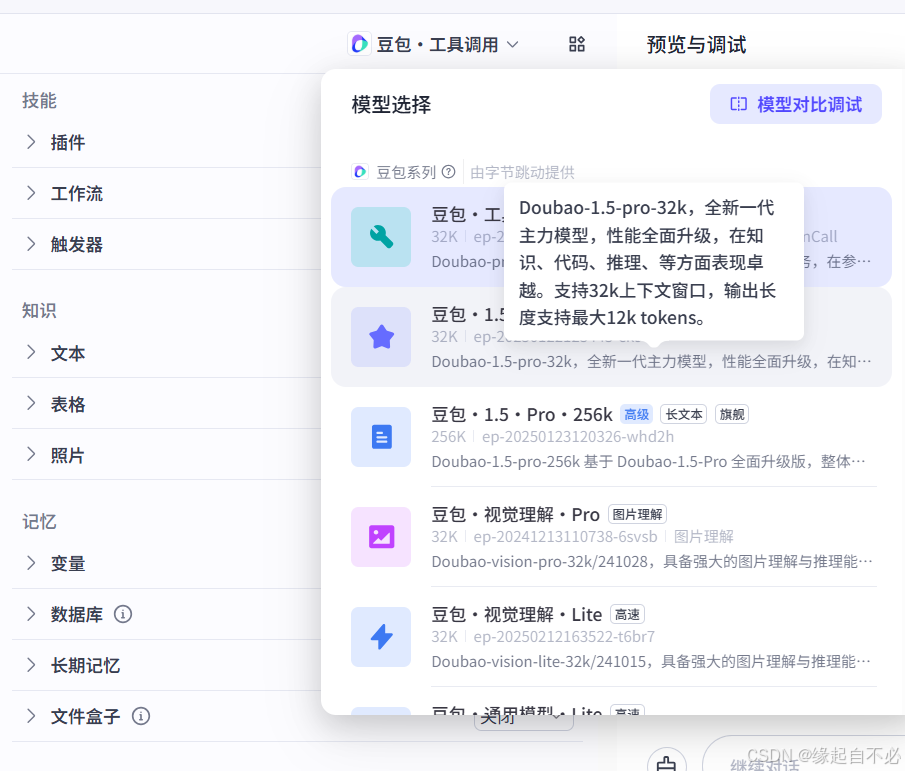 选择基准模型,支持DeepSeek,我们这里使用默认的豆包模型。