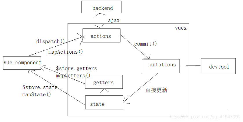 ① 在组件(页面)中,通过dispatch()或mapActions()这个函数分发给actions的函数去处理。② actions的函数可以与后台交互,也可以通过 commit() 提交给mutations去处理。③ mutations 可以直接与devtool(如本地存储工具 → 在实例代码中的utils里的storageUtils.js)交互与直接更新state(数据状态)。④ 如果有计算属