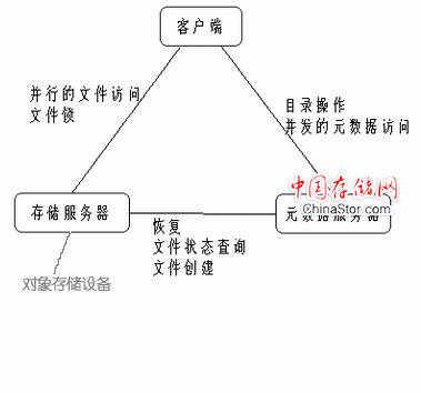 (3) 每个对象元数据的管理。OSD管理存储在其上对象的元数据,该元数据与传统的inode元数据相似,通常包括对象的数据块和对象的长度。而在传统的NAS系统中,这些元数据是由文件服务器维护的,对象存储架构将系统中主要的元数据管理工作由OSD来完成,降低了Client的开销。
