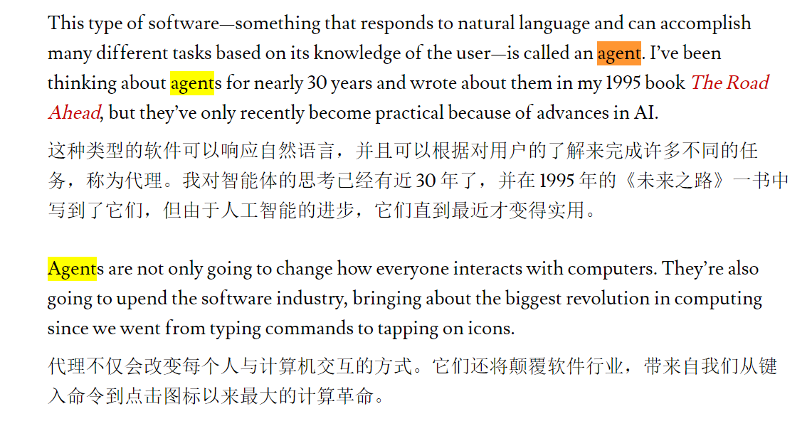 比尔·盖茨2023年曾预言,AI Agent将彻底改变我们使用电子产品的方式,如今,这一预言正逐步成为现实。以下截图是23年11 月 9 日,其在个人网站撰文《AI is about to completely change how you use computers》文章,阐述了人工智能体(Agent)将如何颠覆软件行业。当前这篇大佬的中英文对照版博文也已打包放在AI agent精选资料包中,欢迎自取。