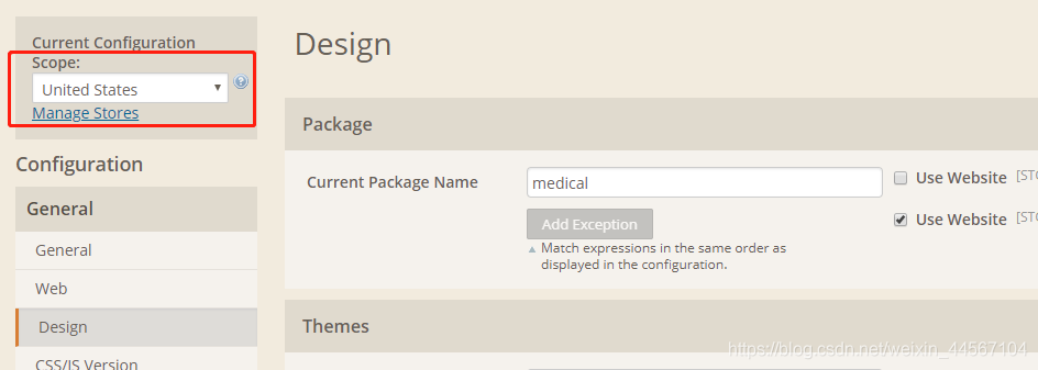 5、设置新站的皮肤在system- Configuration - General -design选项卡下面切换店铺视图到新站的店铺视图,然后填入上一部新建的文件夹名保存