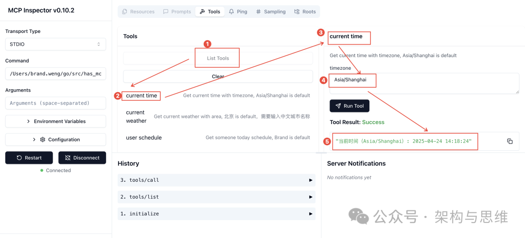 我们给这个服务起名 mcp-go-server,并配置对应的command、args信息,Done之后就出现了一个mcp-go-server服务,并且是绿色标识,代表是连接通的