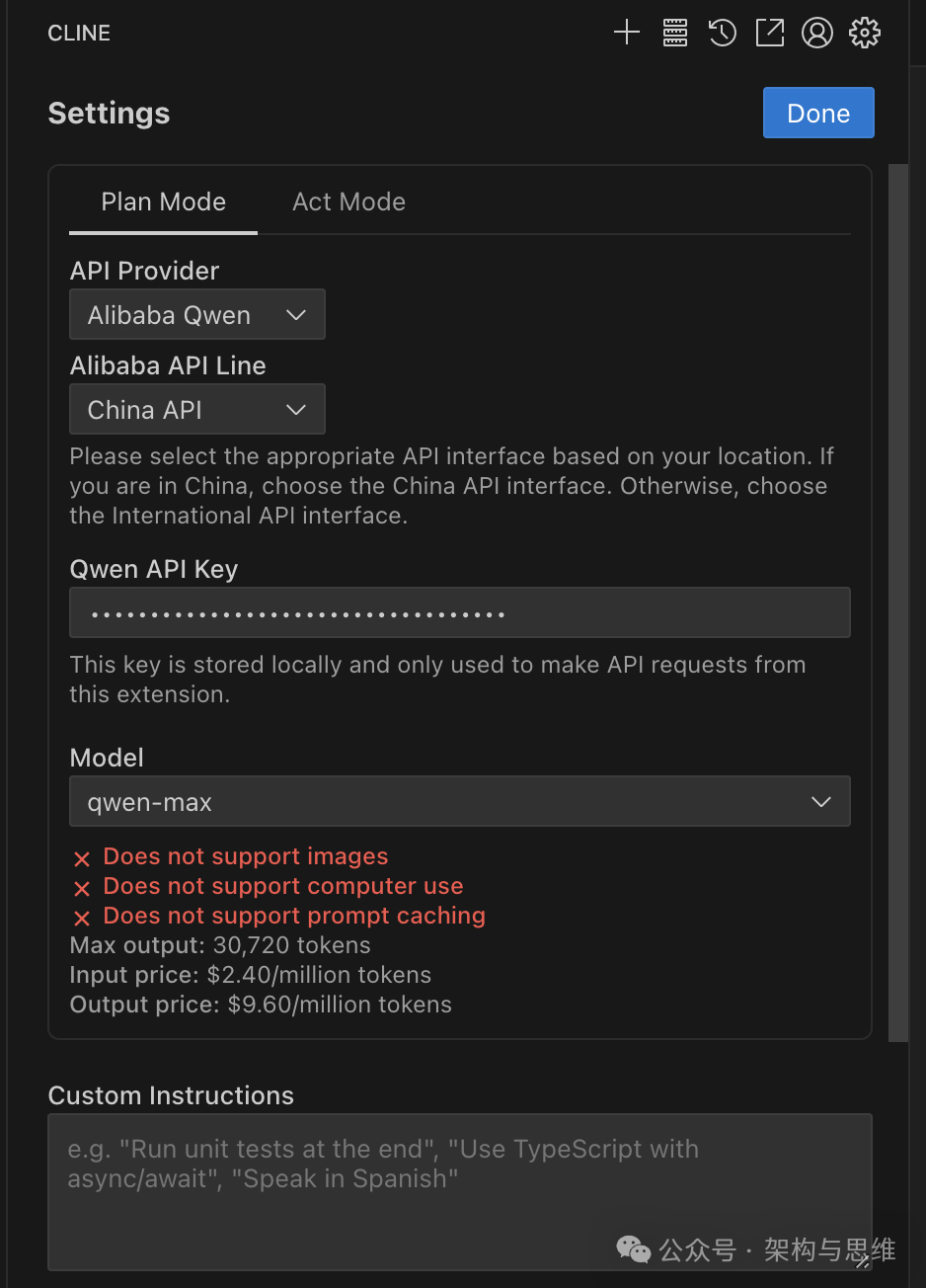 安装完成后,需要做下大模型配置,我这边选用的是qwen-max版本