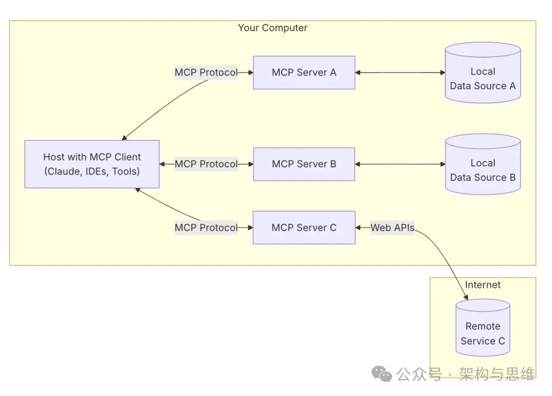MCP 采用客户端-服务器架构,MCP 架构主要包含以下核心组件:Host、Client 和 Server。