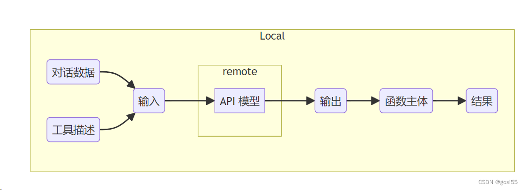 其中,我们将对话数据和工具描述传递给 API 模型。在得到 API 模型的输出后,我们在本地根据输出调用函数,最终得到结果。