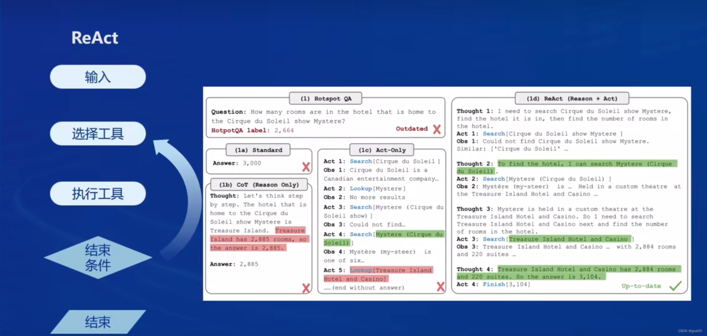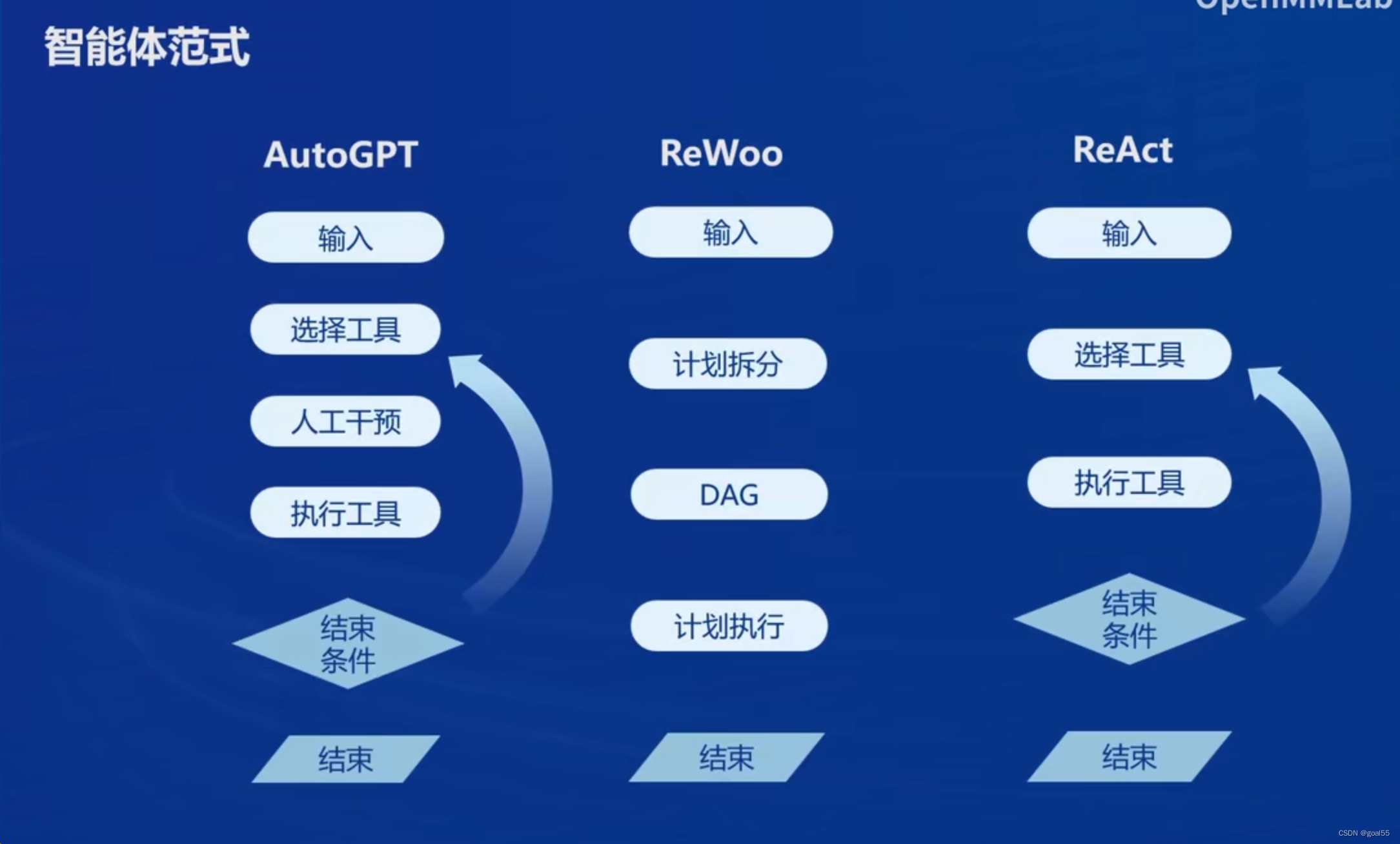流程:在接收用户的输入后会选择相对应的工具进行执行,在拿到工具结束的条件后,模型会近一步思考它是否要选择下一个工具并执行,直到达到结束条件以及完成用户的输入为止,包含推理和行为两部分。一种思维模式