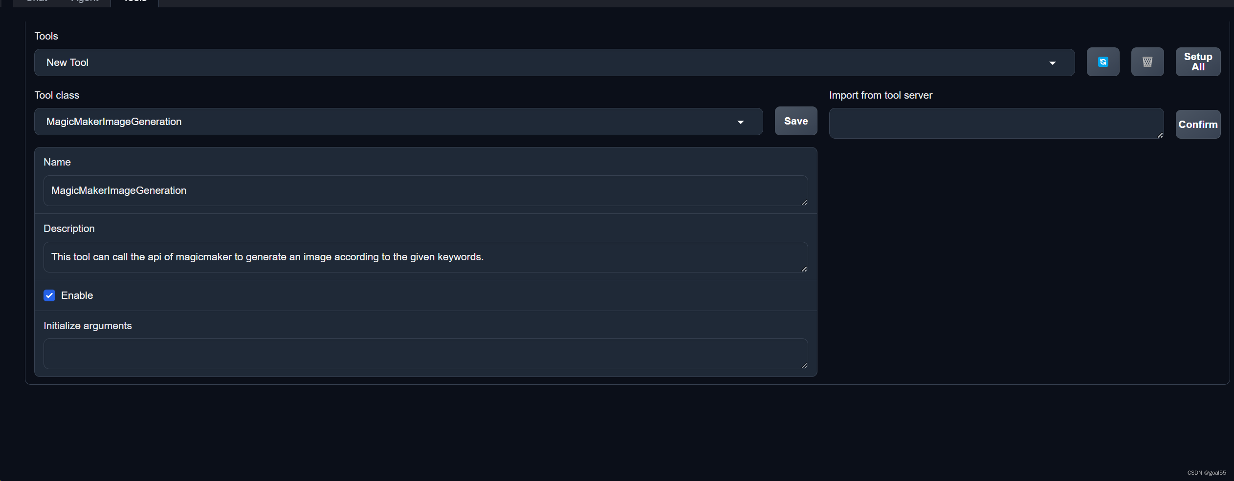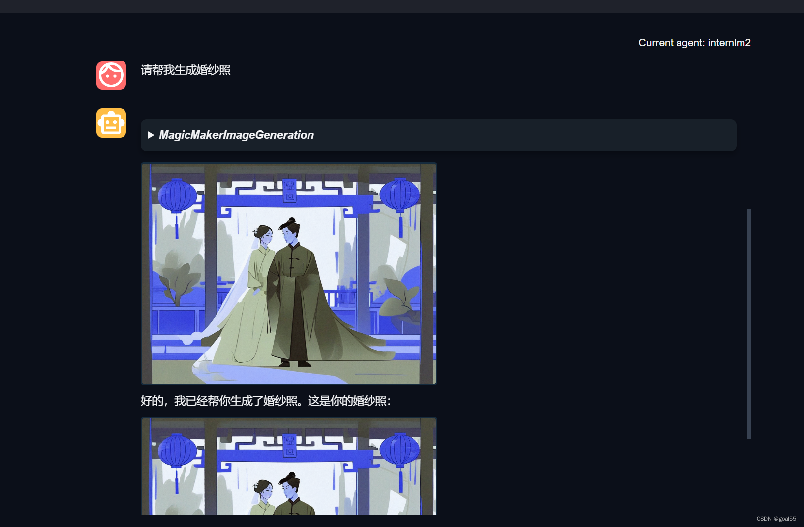 在 Tool 界面选择 MagicMakerImageGeneration 后点击 save 后,回到 Chat 页面选择 MagicMakerImageGeneration 工具后就可以开始使用了。为了确保调用工具的成功率,请在使用时确保仅有这一个工具启用。下图是一个例子。可以看到模型成功地调用了工具并得到了结果。