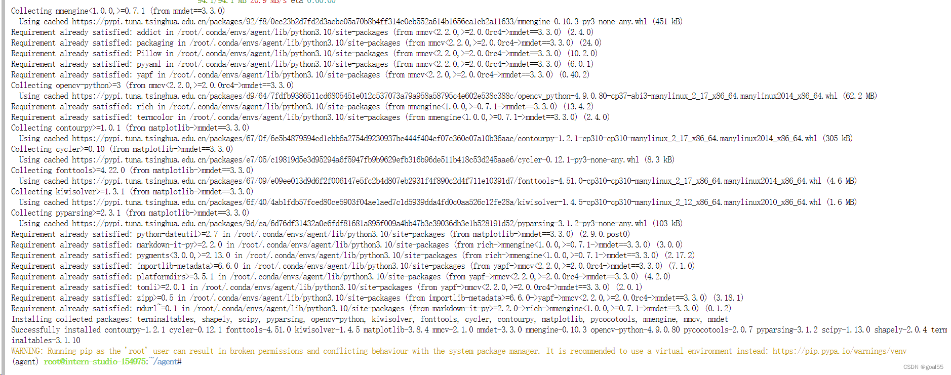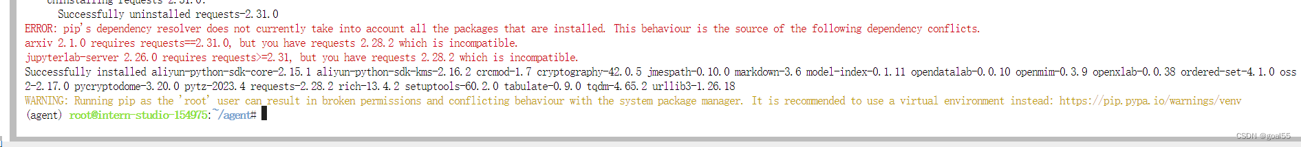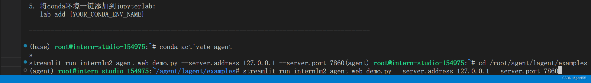 进入开发机后,为了方便使用,我们需要配置一个环境以同时满足 Lagent 和 AgentLego 运行时所需依赖。在开始配置环境前,我们先创建一个用于存放 Agent 相关文件的目录,可以执行如下命令: