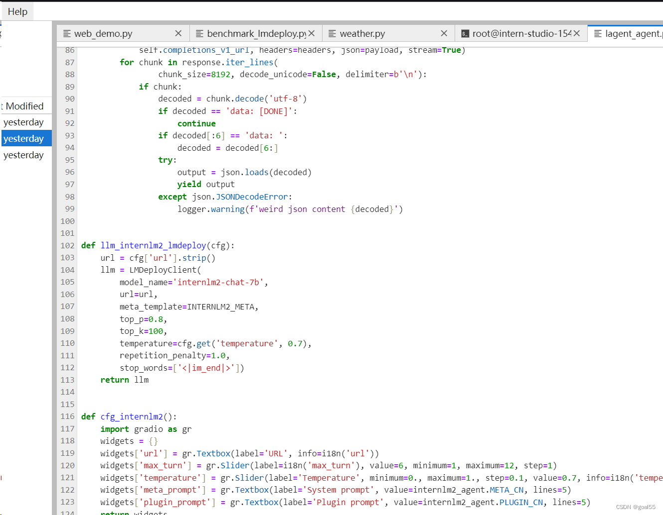 首先通过 touch /root/agent/lagent/lagent/actions/weather.py(大小写敏感)新建工具文件,该文件内容如下: