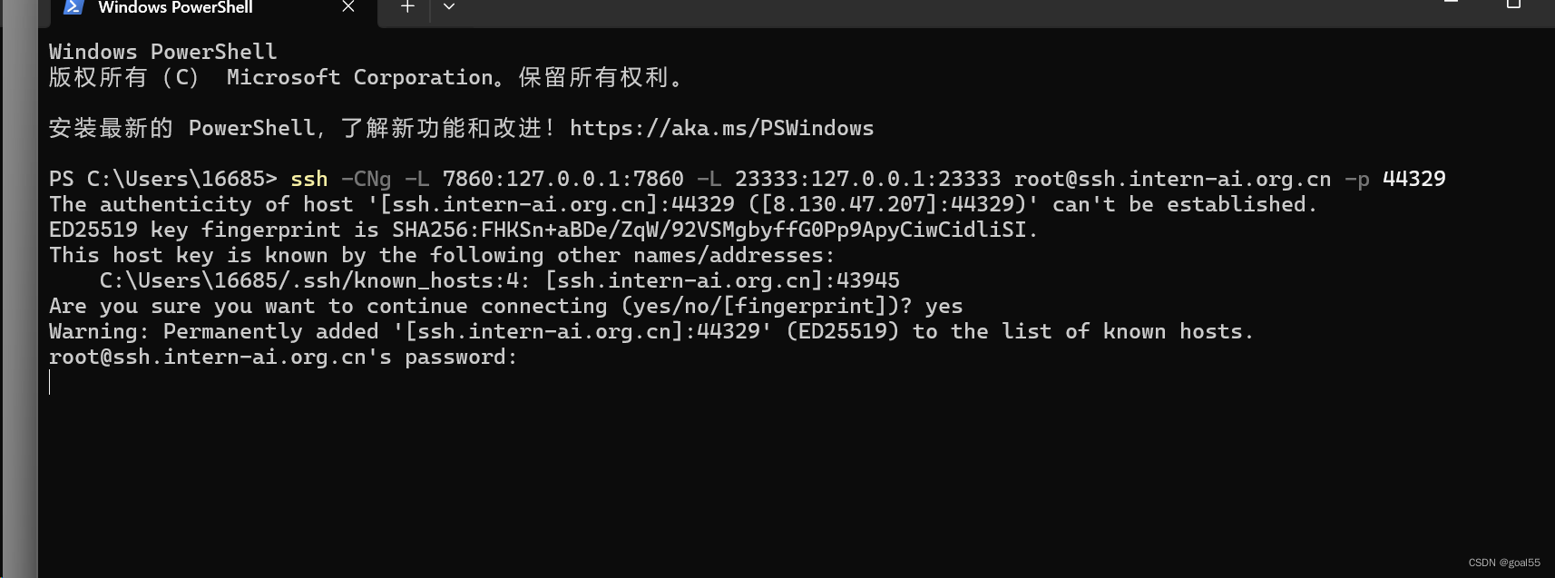 ssh -CNg -L 7860:127.0.0.1:7860 -L 23333:127.0.0.1:23333 root@ssh.intern-ai.org.cn -p 你的 ssh 端口号