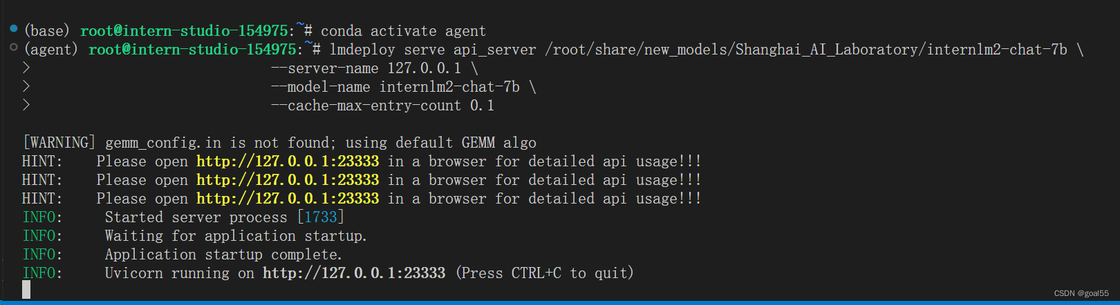 在等待 LMDeploy 的 api_server 与 Lagent Web Demo 完全启动后(如下图所示),在本地进行端口映射,将 LMDeploy api_server 的23333端口以及 Lagent Web Demo 的7860端口映射到本地。可以执行: