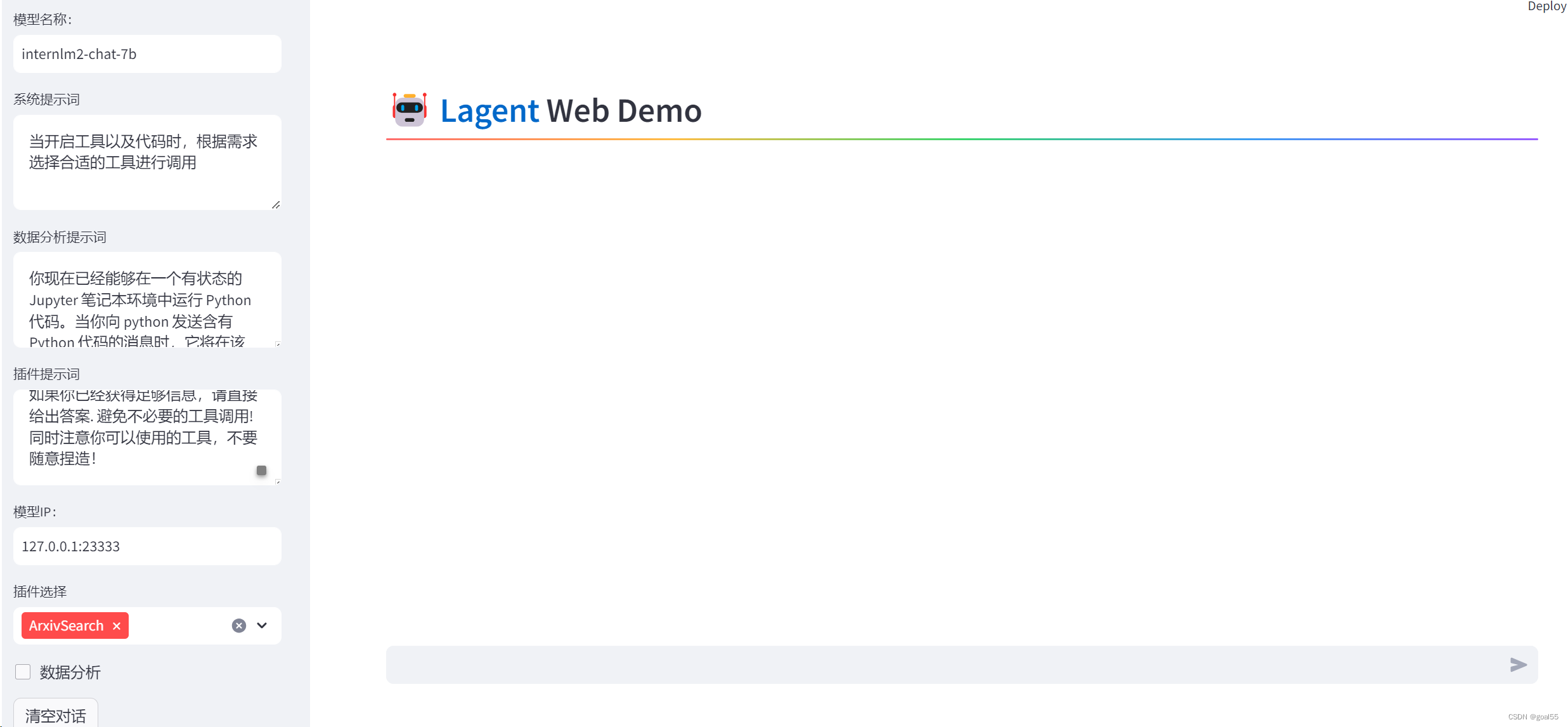 接下来在本地的浏览器页面中打开 http://localhost:7860 以使用 Lagent Web Demo。首先输入模型 IP 为 127.0.0.1:23333,在输入完成后按下回车键以确认。并选择插件为 ArxivSearch,以让模型获得在 arxiv 上搜索论文的能力。