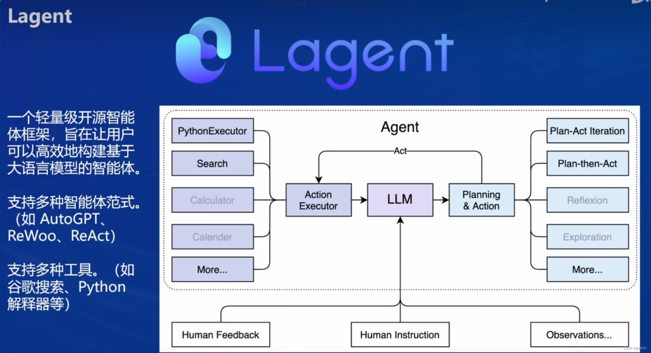 Lagent 是一个轻量级开源智能体框架,旨在让用户可以高效地构建基于大语言模型的智能体。同时它也提供了一些典型工具以增强大语言模型的能力。