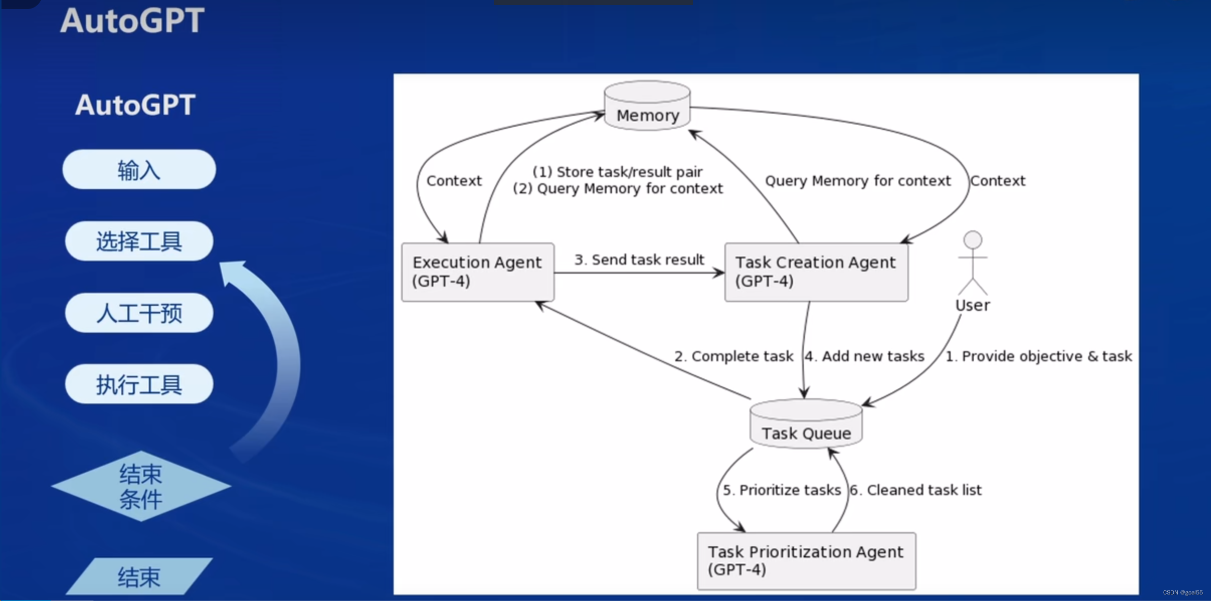 基本流程:用户将目标和任务输入给整个系统后,任务的列表将任务发送给相对应的智能体,智能体在执行后会将相关的结果以及任务存储到记忆当中,并且把相关的结果发给另外一个智能体,由这个智能体创建出新的任务后,由此循环直到最终的完成任务