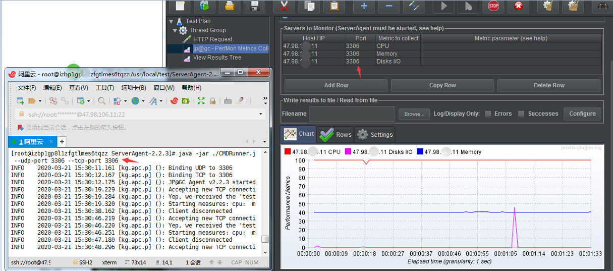 jmeter持续运行,并监控ip,3306端口的cpu,memory等;