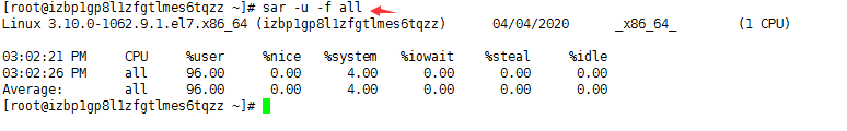 1)监控所有资源的报告;sar -A -o all 5 1 ;每5秒采样一次,连续采样1次;观察所有资源的使用情况,并将采样结果以二进制形式存入文件all中;