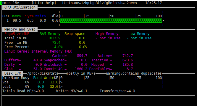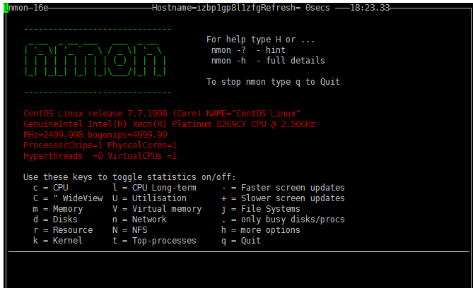 6.输入nmon,启动nmon; 下图显示了不同快捷键的用法;