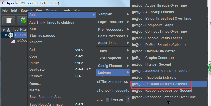 打开jmeter,添加线程组——添加监听器 jp@gc-PerfMon Metrics Collector;