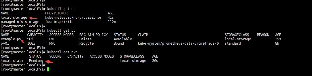 这里的volumeBindingMode: WaitForFirstConsumer很关键,意思就是延迟绑定,当有符合PVC要求的PV不立即绑定。因为POD使用PVC,而绑定之后,POD被调度到其他节点,显然其他节点很有可能没有那个PV所以POD就挂起了,另外就算该节点有合适的PV,而POD被设置成不能运行在该节点,这时候就没法了,延迟绑定的好处是,POD的调度要参考卷的分布。当开始调度POD的时候看看它要求的LPV在哪里,然后就调度到该节点,然后进行PVC的绑定,最后在挂载到POD中,这样就保证了POD所在的节点就一定是LPV所在的节点。所以让PVC延迟绑定,就是等到使用这个PVC的POD出现在调度器上之后(真正被调度之前),然后根据综合评估再来绑定这个PVC。